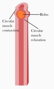 In much of the gastrointestinal tract, smooth muscles contract in sequence to produce a peristaltic wave which forces a ball of food (called a bolus while in the esophagus and gastrointestinal tract and chyme in the stomach) along the gastrointestinal tract. Peristaltic movement is initiated by circular smooth muscles contracting behind the chewed material to prevent it from moving back into the mouth, followed by a contraction of longitudinal smooth muscles which pushes the digested food forward.”